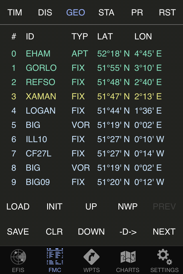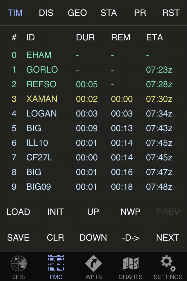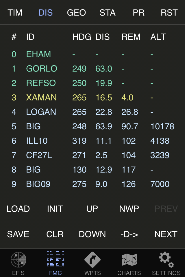 TIM stands for time and displays each of the waypoints with the associated duration (at current ground speed), remaining time until being reached and ETA. Pressing the forward arrow allows you to move to the next page of the plan. Pressing the back arrow will go back. All legs are calculated at instant ground speed. Times are cummulative and adjusted automatically as you move along. The route can be displayed in one of four modes: TIM, DIS, GEO and STA.Distance Mode