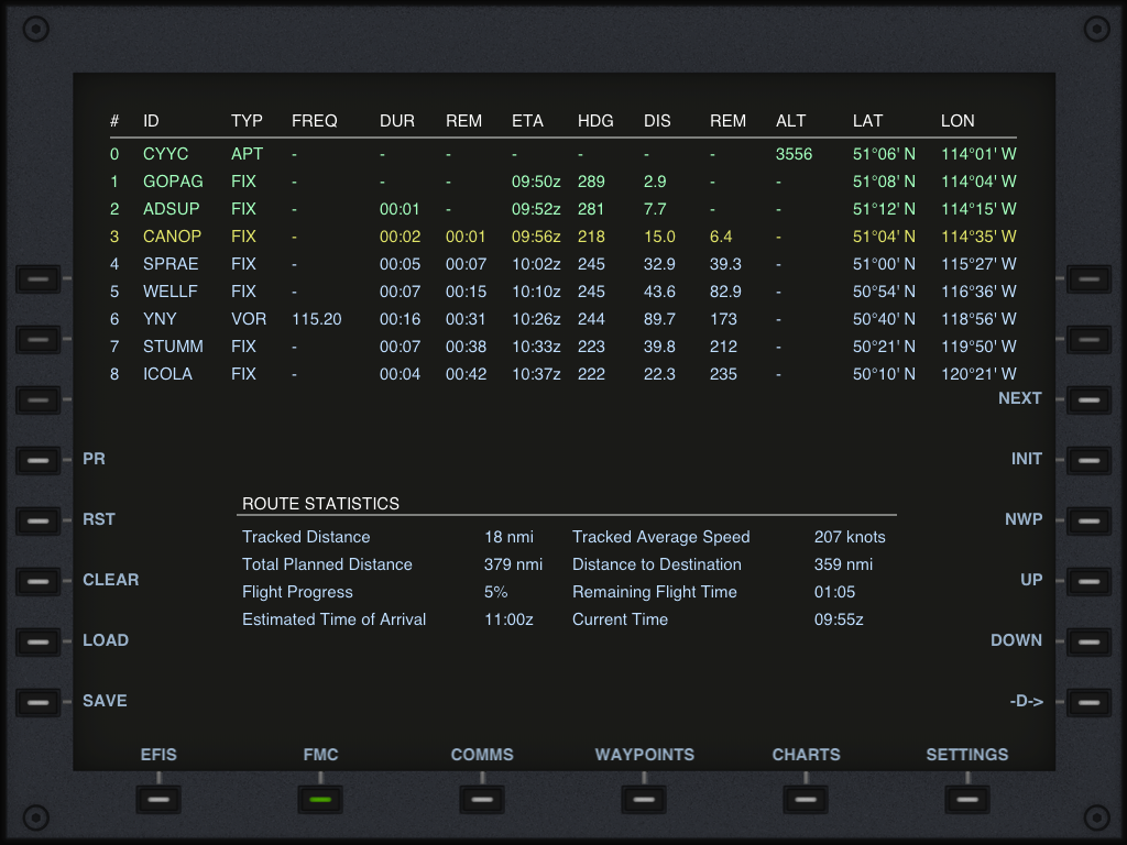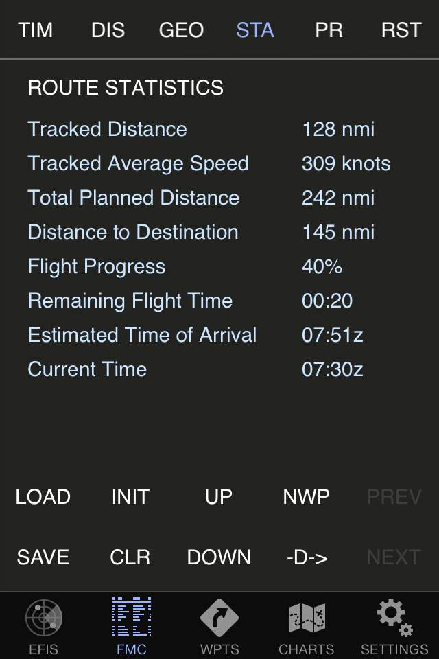 In this mode the FMC will show route statistics. Information regarding the flown, planned and remaining distances will be calculated and provided as well as flight progress. Furthermore, an estimate of the remaining flight time and ETA is calculated based on the instant ground speed and the waypoints entered in the plan.The FMC also computes the tracked travelled distance and average speed. By pressing the RST button these counters can be reset.
