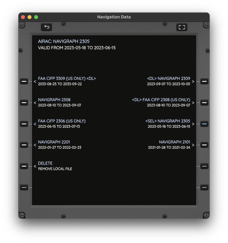The Nav Data PanelAirTrack comes with a built-in navigation data set called an AIRAC. The data is significantly old and out of date, courtesy of Navigraph. It's good for basic flight but if you fly online in networks such as VATSIM or IVAO, you may need a more up to date AIRAC. There is the possibility of subscribing / logging into Navigraph at their web site for the latest cycle, or to subscribe US centric FAA CIFP from within the app. In either case, the Nav Data page allows the selection and download of data sets or AIRACS. This data objects are then used throughout the app for flight planning, radio navigation and all other intents and purposes.